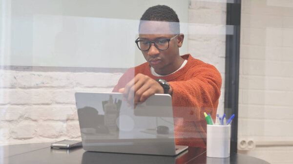 652679480 Concentrated businessman in eyeglasses waving hand and looking at tablet, online video call and business conference. Concept of internet, digital meeting and technology