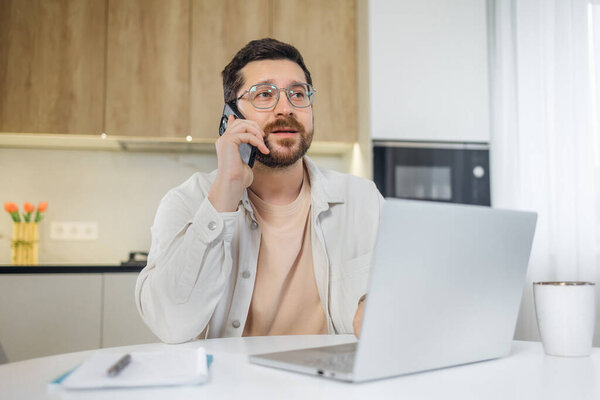 728680346 Software designer discussing a new project with his client on the phone. Creative business man working on a laptop on kitchen work remotely from home
