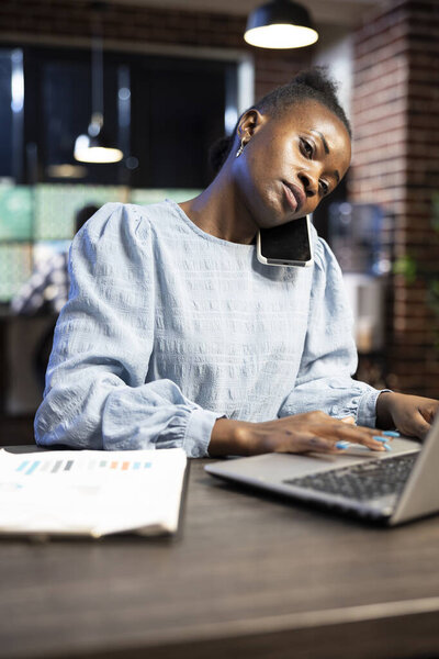 804772832 Focused entrepreneur multitasks at her workstation, speaking on smartphone and entering financial information into laptop, ensuring accuracy in stock market analysis. Black woman working a night shift