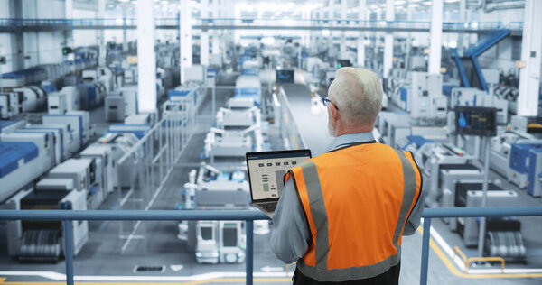 737502012 Portrait of a Thoughtful Middle Aged Engineer Monitoring and Analyzing Conditions at a Modern Electronics Factory with Automated Robots Working with