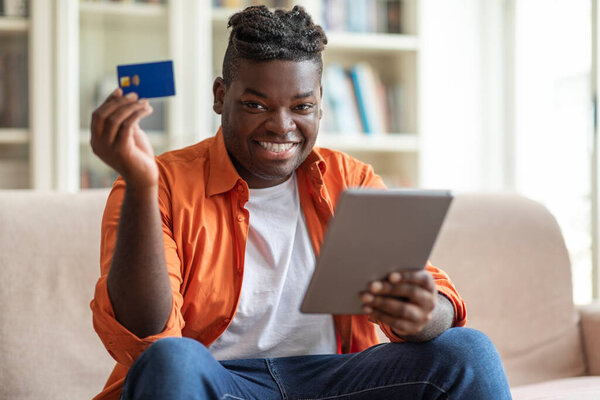 647208046 Happy cheerful handsome young black guy in casual customer sitting on couch at home, showing modern digital tablet and plastic blue bank card, recommending online banking, shopping, copy space