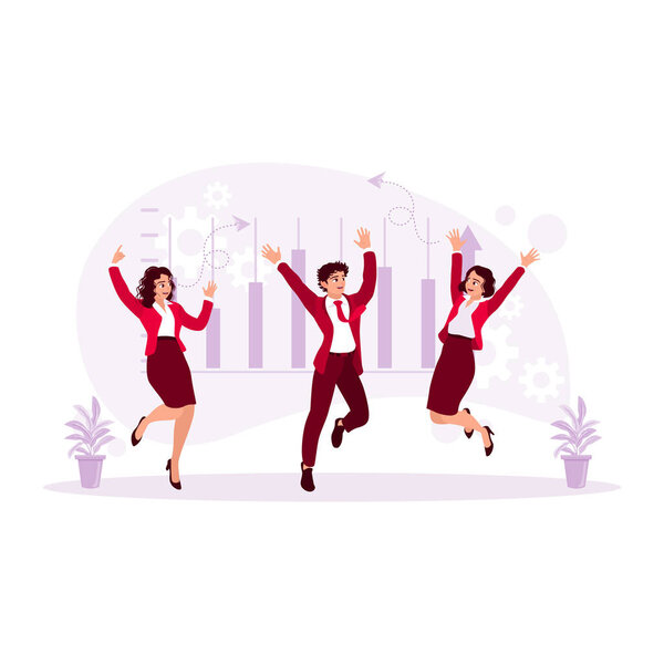 684247984 Group of young businessmen jumping together celebrating the success of work project in office. Employees Working concept. Trend Modern vector flat illustration