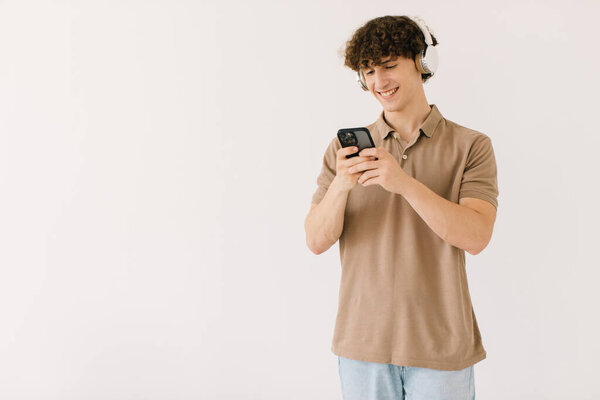 643671944 Attractive young male student in modern headphones using phone on a white background with free space
