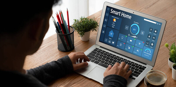 735856012 Smart home technology, centric remote control system with digital dashboard for air conditioning, safety security network or house automation. App software, ui panel programming IOT monitor snugly