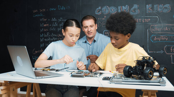 739408580 Caucasian teacher talking about electric tool while student fixing robotic model on table with electronic equipment placed. Diverse academic children learning about main board structure. Edification.