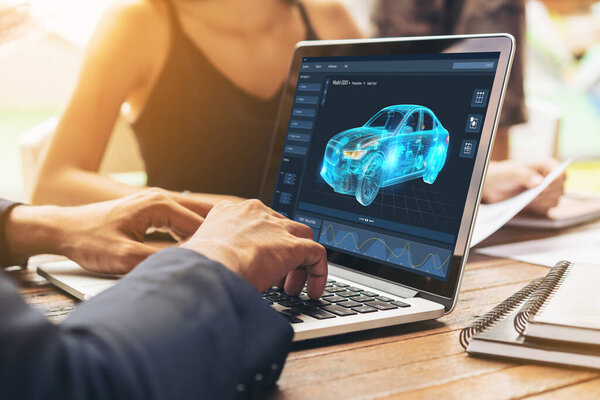 792576128 Electric car design software on computer screen showing simulation blueprint snugly by digital calculating application for manufacturing preparation
