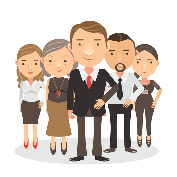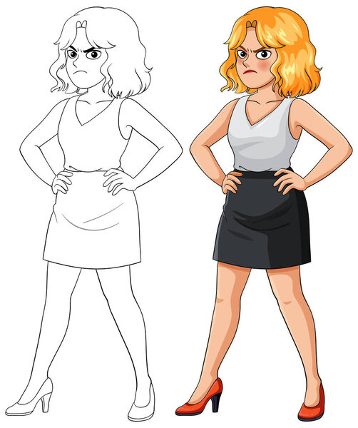 858505366 Vector illustration of assertive businesswoman, colored and outline versions, bold pose, flat style