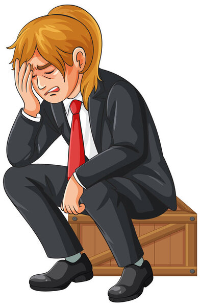 861560364 Vector illustration of stressed businesswoman in suit, sitting on crate, hand on face, isolated