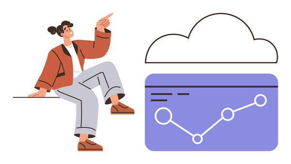 864942210 Data analysis, cloud computing, technology education, business strategy, digital analytics, forecasting trends. Young woman pointing at graph under cloud. Data analysis and cloud computing concept