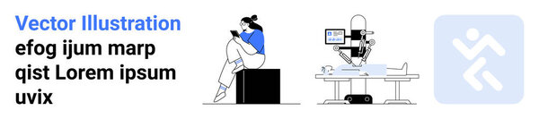 767299566 Young woman reading a book on steps, robot performing surgery with a patient on operating table, medical application icon. Ideal for technology, healthcare, education, automation, digital