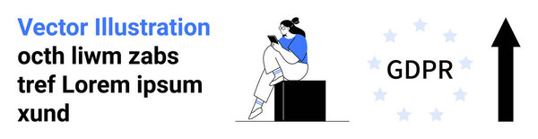 768232690 Young woman using smartphone, sitting on a box. GDPR compliance represented by upward arrow and stars. Placeholder text included. Ideal for web design, data protection, privacy laws, tech usage, user