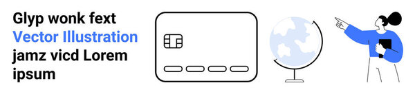 769600654 Person pointing at a globe while holding a tablet beside text paragraph and credit card image. Ideal for education, travel, global business, financial services, e-learning, world exploration