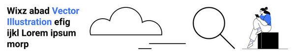 774296156 Cloud icon, large magnifying glass, young woman seated reading a book on a black box, and textual elements in a minimalist, modern style. Ideal for education, technology, data search, cloud