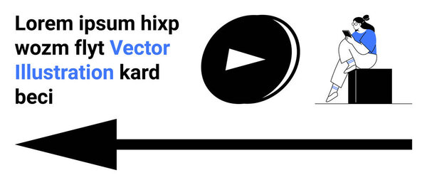 774313164 Young woman sitting and using a tablet, large play button, thick black arrow pointing left, and dummy text. Ideal for e-learning, instructional guides, user manuals, online content, presentations
