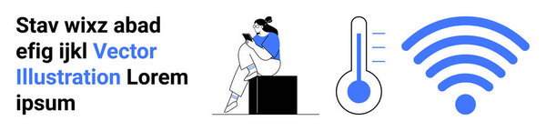 777464124 Young woman with smartphone seated against cube, large thermometer icon, wireless signal symbol, placeholder text. Ideal for technology, connectivity, communication, reading, information