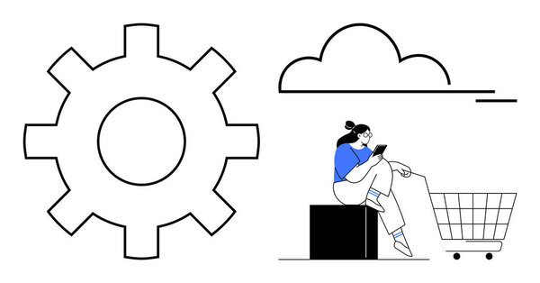 778827792 Gear icon, cloud line art, young woman seated, interacting with device, shopping cart beside her. Ideal for online shopping, e-commerce, technology, modern lifestyle cloud services automation