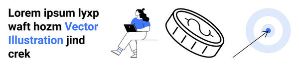 779487186 Young woman seated with tablet, large coin, and target with arrow. Ideal for goal setting, financial success, motivation, productivity, focus, strategy, efficiency. Landing page