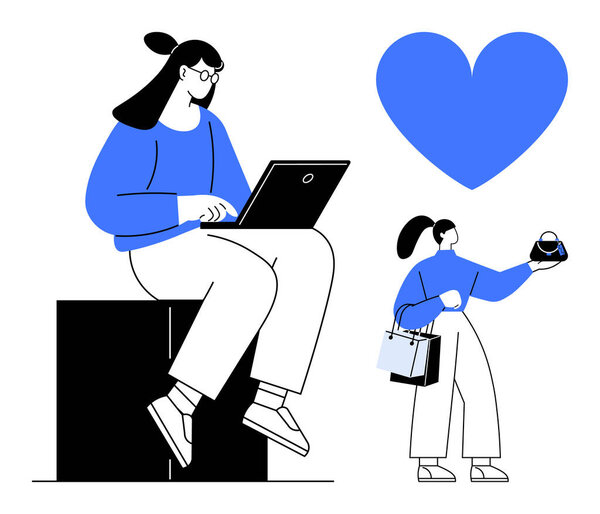 786432486 Young woman working on laptop and another holding shopping bags and coffee, blue heart symbol conveying balance. Ideal for work-life balance, productivity, multitasking, self-care, time management