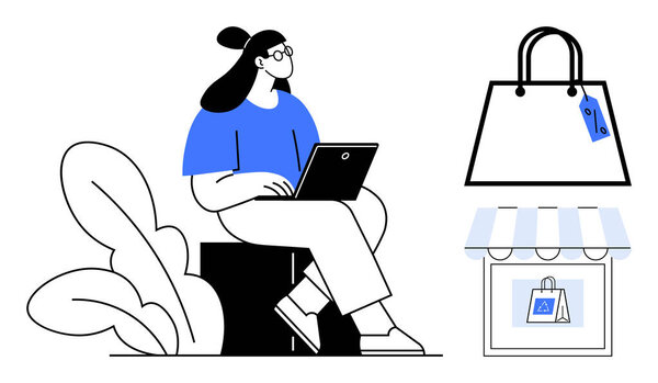 792206820 Young woman using laptop seated near plant, shopping bag with price tag and storefront. Ideal for online shopping, digital commerce, retail marketing, consumer behavior, e-commerce solutions