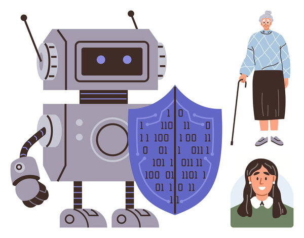 827348964 Robot holding shield imprinted with binary codes, representing data protection for people of all ages. Ideal for cybersecurity, AI ethics, elder care, personal safety, tech accessibility, innovation