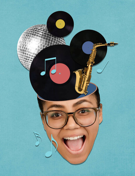 624703298 Contemporary art collage. Creative design. Cheerful young woman with musical instruments inside head symbolizing music and party lifestyle. Concept of surrealism, creativity, imagination, thoughts