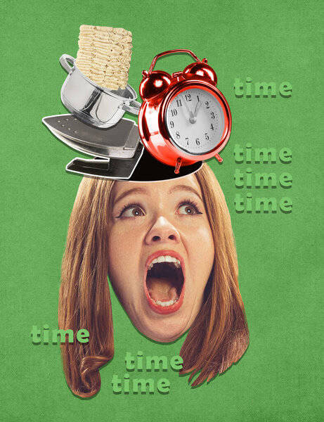 624703928 Contemporary art collage. Creative design. Young woman having many domestic duties to be done. Lack of time. Concept of surrealism, creativity, imagination, thoughts, lifestyle