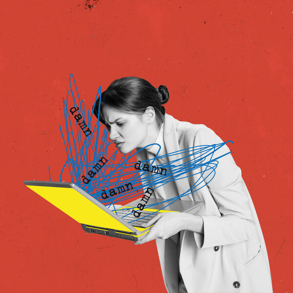 633675196 Contemporary art collage. Conceptual creative design. Young woman, employee looking on laptop, working. Difficult tasks. Concept of surrealism, business, imagination, lifestyle, occupation and career