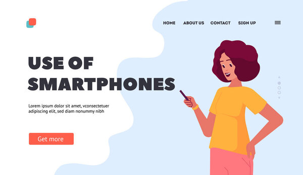 633110518 Smartphone Use Landing Page Template. Young Woman Send Messages to Friends. Girl Character Texting Sms or Call on Mobile Phone. Telephone Addiction to Social Network. Cartoon Vector Illustration