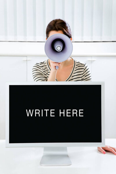 627095038 Young woman yelling to loudspeaker with ONLINE REVIEWS inscription, social networking concept