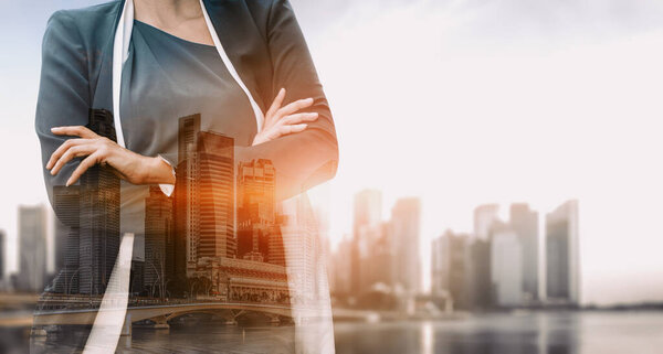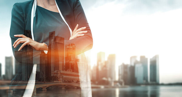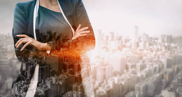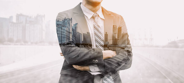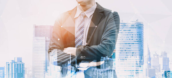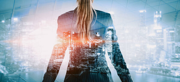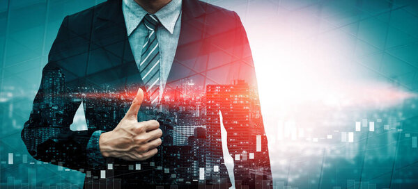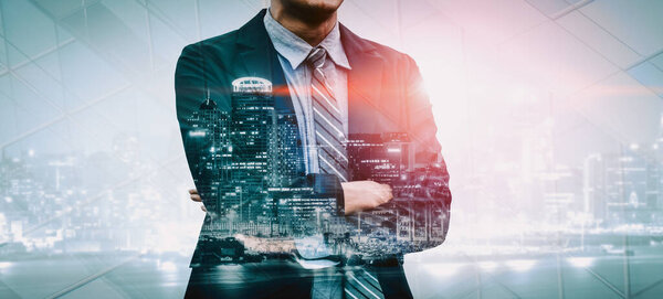 699270070 Double Exposure Image of Business Person on modern city background. Future business and communication technology concept. Surreal futuristic cityscape and abstract multiple exposure interface. uds