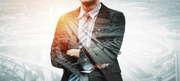 729083464 Double Exposure Image of Business Person on modern city background. Future business and communication technology concept. Surreal futuristic cityscape and abstract multiple exposure interface. uds