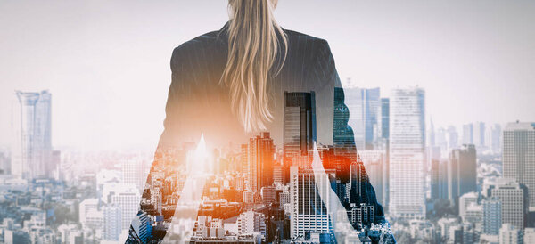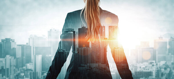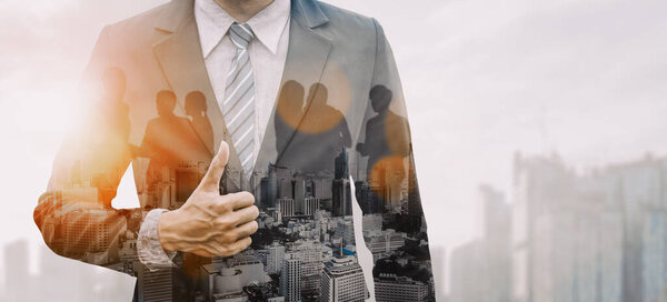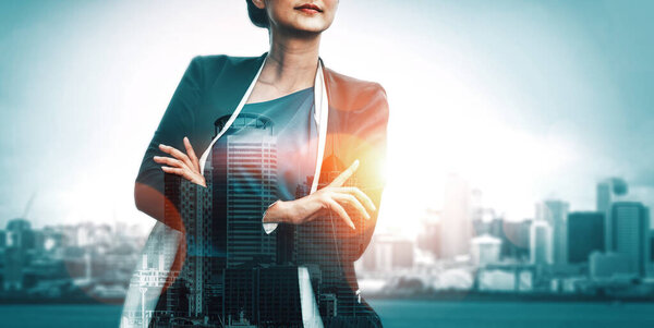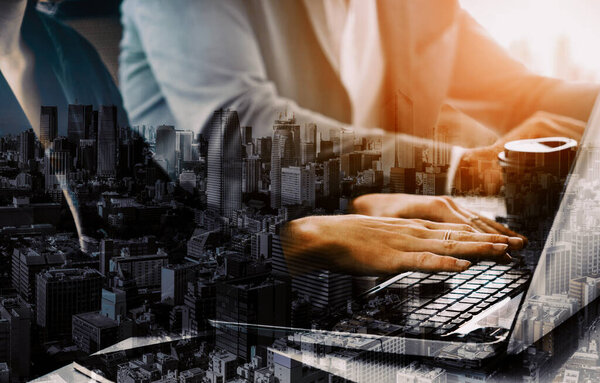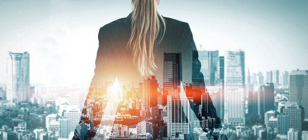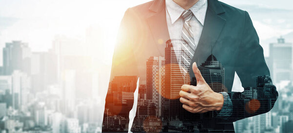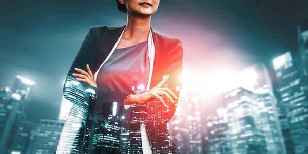 736337336 Double Exposure Image of Business Person on modern city background. Future business and communication technology concept. Surreal futuristic cityscape and abstract multiple exposure interface. uds