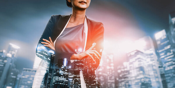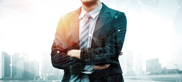 699683620 Double Exposure Image of Business Person on modern city background. Future business and communication technology concept. Surreal futuristic cityscape and abstract multiple exposure interface. uds