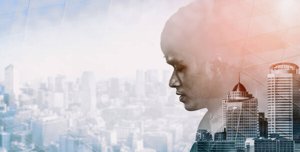 725477250 Double Exposure Image of Business Person on modern city background. Future business and communication technology concept. Surreal futuristic cityscape and abstract multiple exposure interface. uds