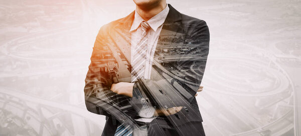 715282164 Double Exposure Image of Business Person on modern city background. Future business and communication technology concept. Surreal futuristic cityscape and abstract multiple exposure interface. uds