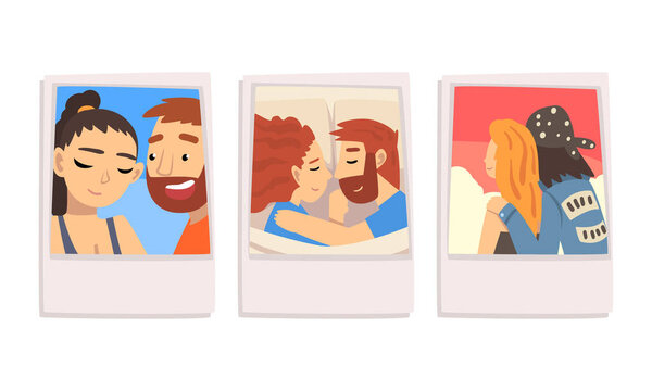 513629784 Man and Woman Couple on Photographic Print or Snapshot Vector Set. Rectangular Photo Card with Smiling Male and Female Concept