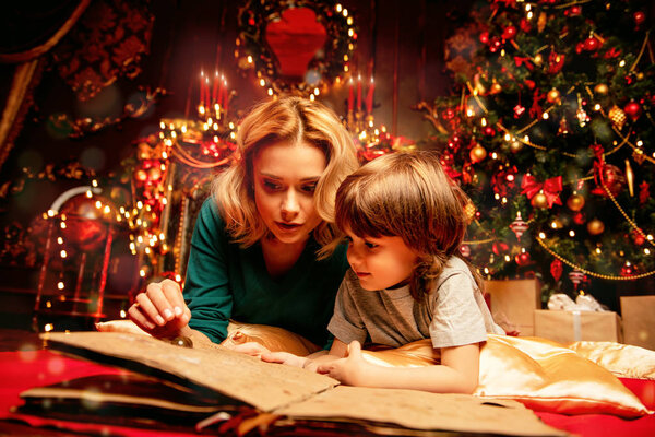 318523282 Mother and her son are reading a book at home decorated for Christmas. Family miracle time. Merry Christmas and Happy New Year.
