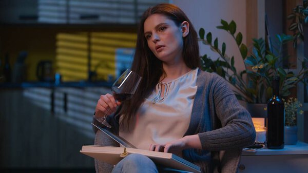837720252 Thoughtful sad woman girl alone home night looking photo album drinking glass wine relax in evening apartment pictures images memories thinking upset regrets alcohol drink addict 30s female housewife