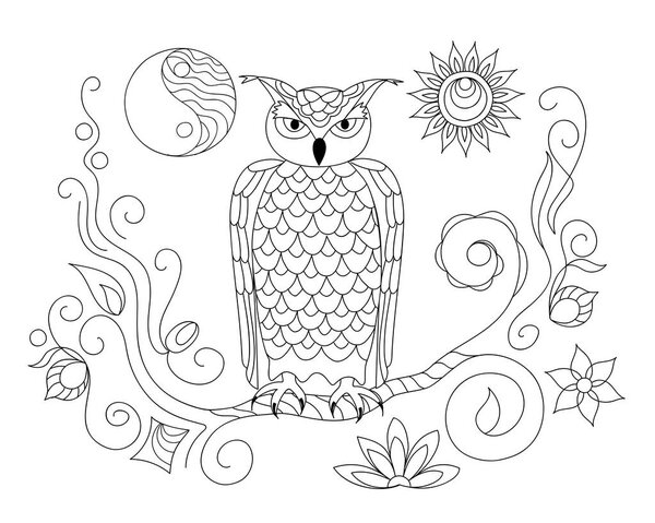 210757414 Coloring page with hand drawn patterned owl on the twig and yin yang sun symbol for adult antistress coloring book, album, wall mural, tattoo template. eps 10