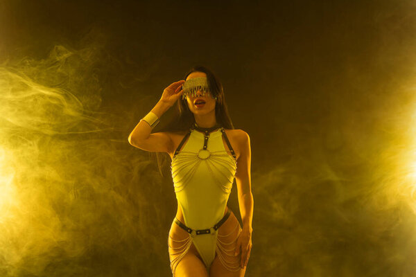 788407218 Girl DJ in neon lights with glasses and headphones. Beautyful woman in violet paint on her face and body. Portrait of sexy TDJ at club party