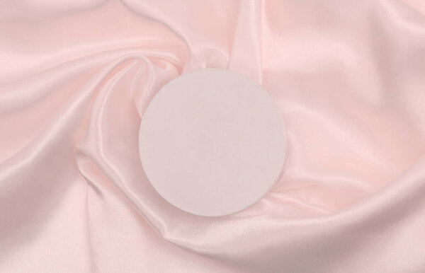 696083442 Circle canvas paper frame label on beige silk fabric background. Abstract copy space texture.