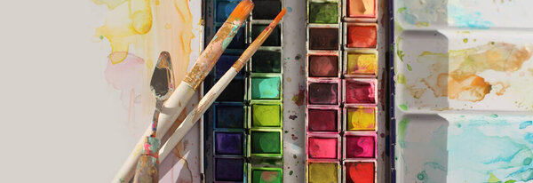727385462 Watercolor palette box and paintbrush, palette knife. Top view horizontal long copy space background. Creative mess in the artistic workshop.