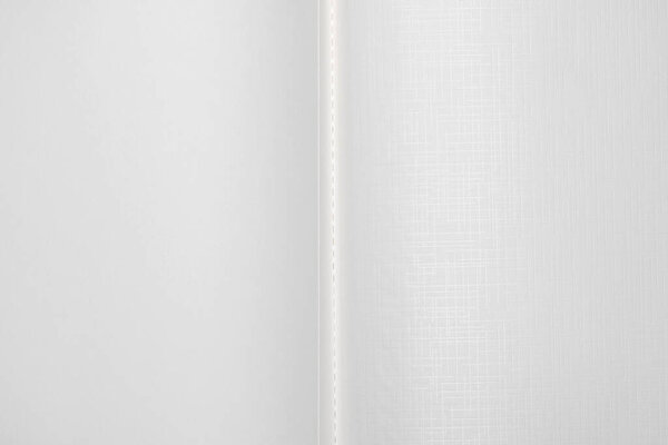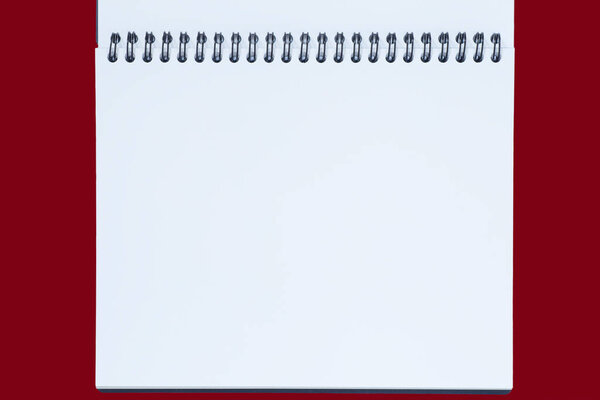 820281154 Close up of blank white page of opened sketchbook with spiral binder against red background