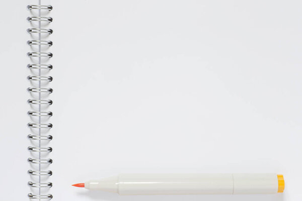 813858836 Close up of opened orange marker laying on blank page of sketchbook