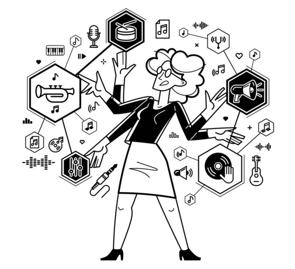 691136868 Music producer composing new track vector outline illustration, sound engineer doing his job in recording studio, composer creating audio mix.