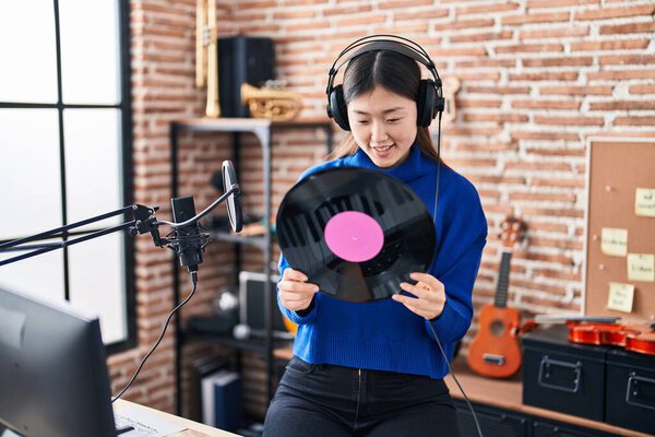 687139156 Chinese woman artist smiling confident holding vinyl disc at music studio