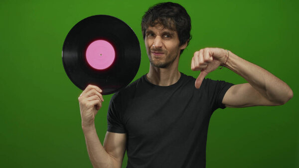827562304 Man holds vinyl record with pink label and shows a thumbs down gesture in a vibrant green studio; disapproval.