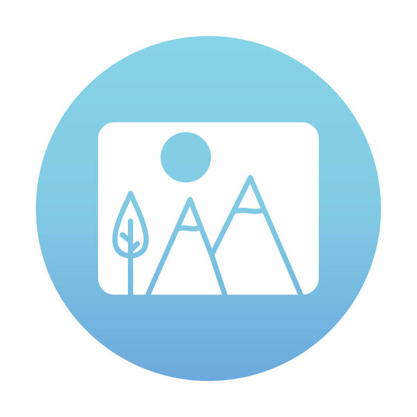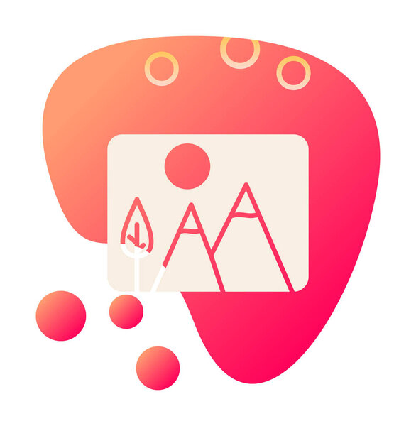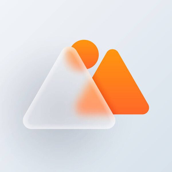 627290298 Mountains in shape of triangles with circle of sun, glassmorphism 3D icon with gradient, blur and transparency, symbol denoting image. Vector modern trend icon in the style of glass-morphism