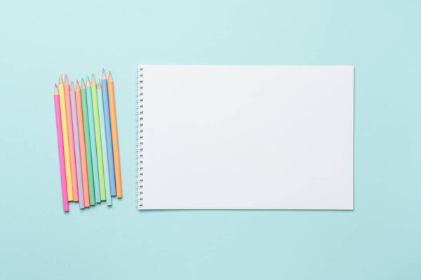 835933926 Sketch book or Drawing album and colored pencils. Accessories for drawing and creativity.