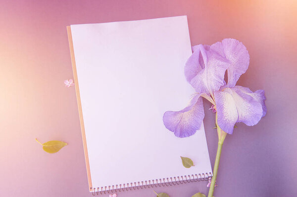 639478078 Empty space white list with gentle iris flower, floral mockup
